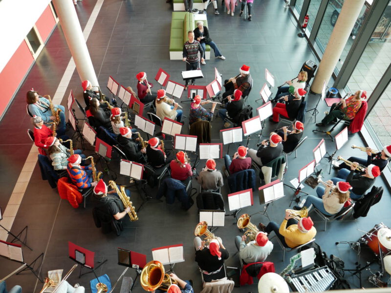 Viele bekannte Weihnachtslieder, nicht nur die von früher, sondern auch durch Pop und Rock zu liebgewordenen Ohrwürmern gespielte Christmas-Songs ertönten durch die Krankenhaus-Eingangshalle. Aber auch durch die Aufzüge wurde die Musik bis in die oberen Etagen getragen. Wer mobil war, kam direkt zum Orchester, wer Dienst hatte, verweilte einen Moment und lauschte, einige huschten ein wenig langsamer durch die Gänge. Über 40 Musikerinnen und Musiker saßen dort mit roten Mützen, teilweise mit Lichterketten umhängt und spielten so voller Freude.