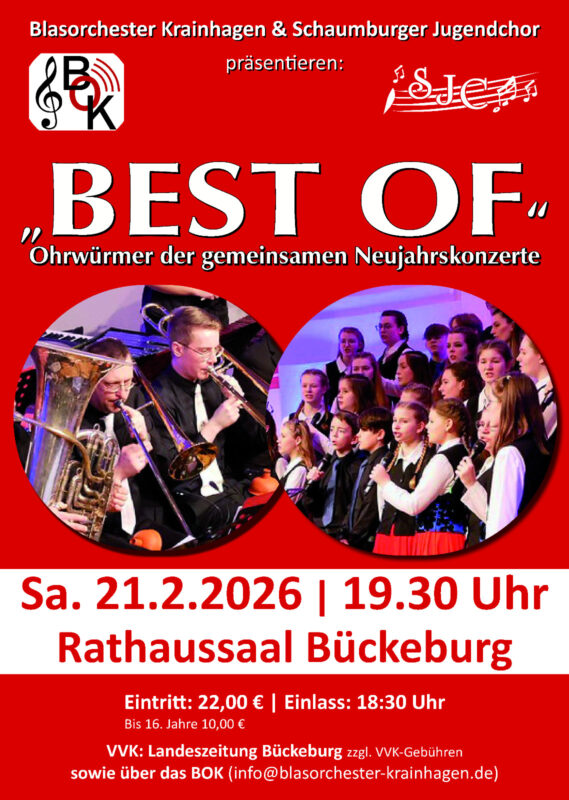 Am Samstag, 21. Februar 2026, 19.30 Uhr, präsentiert das BOK Blasorchester Krainhagen sein erstes Schaumburg Proms Konzert 2026 im Rathaussaal in Bückeburg.